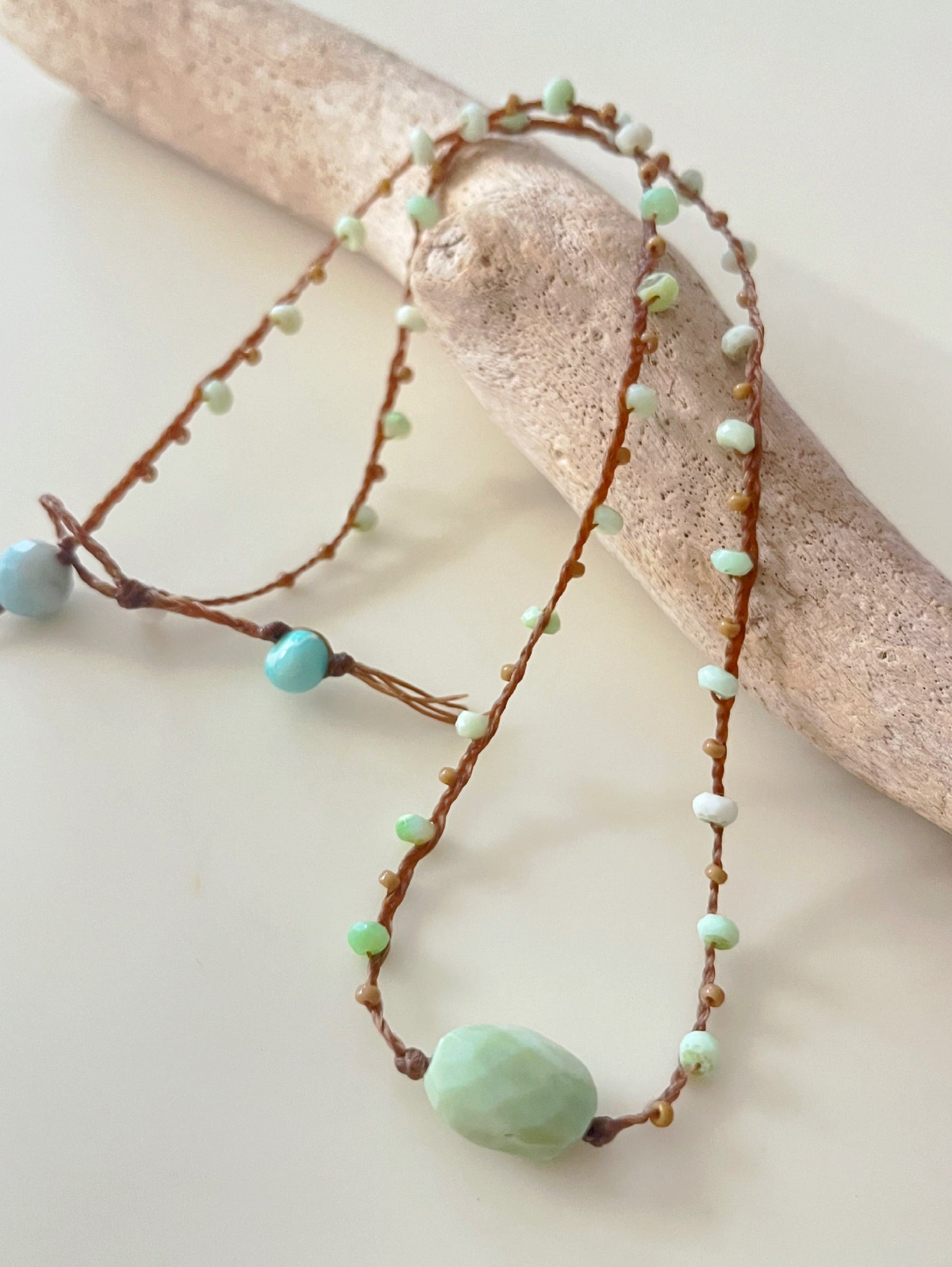 素材:ヘッドチャーム(ぺルビアンミントブルーオパール1cmX1.5cm)・ミントオパール(ロンデル4mm)・シードビーズ(11/0ブラウン)・シニューワックスコード(ブラウン)