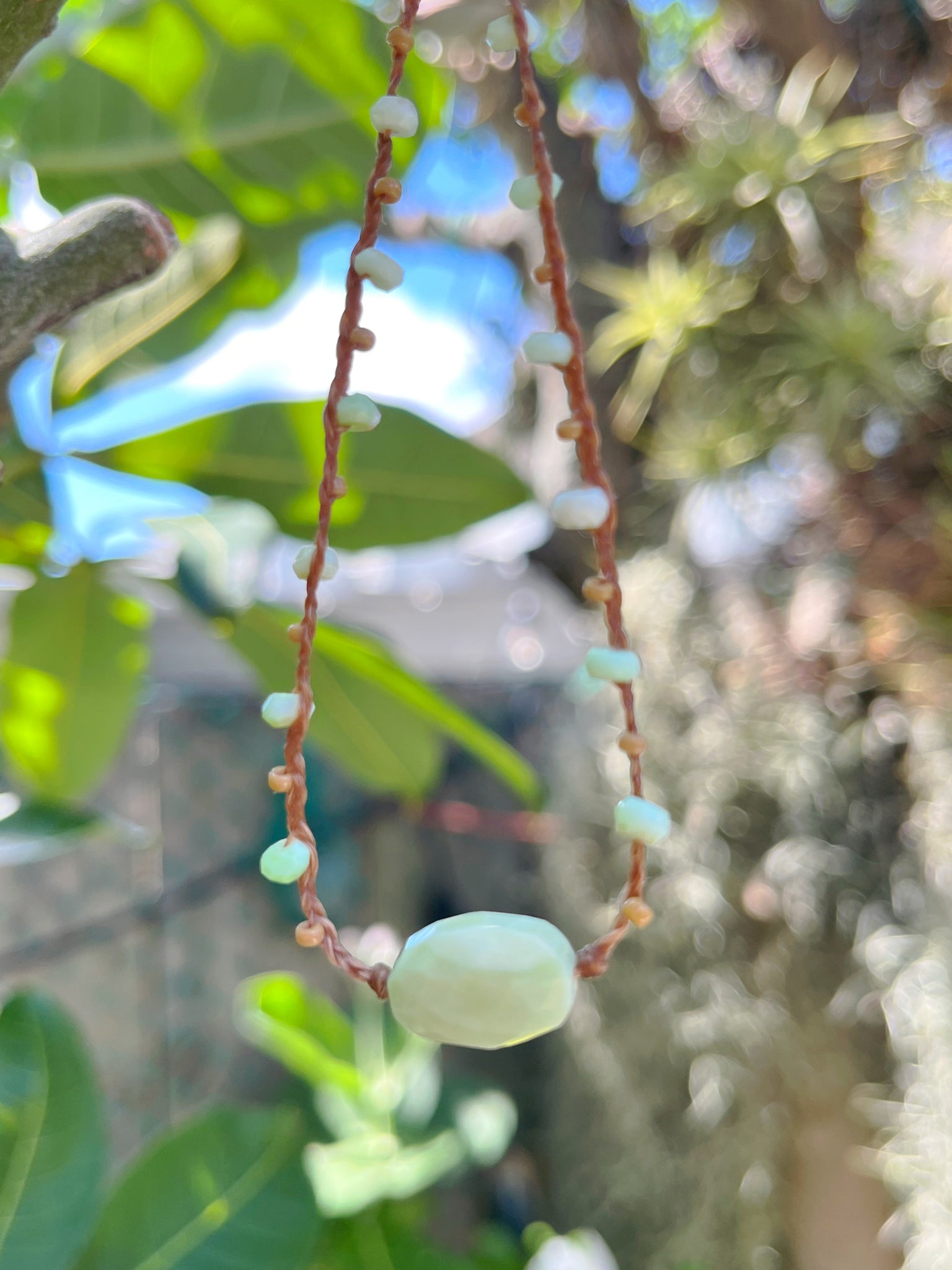 Materials: head charm (peruvian mint blue opal 1cmx1.5cm)/mint opal( faceted rondelle 4mm)/seed beads(11/0 brown)/sinew wax cord(brown)