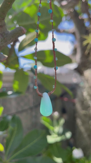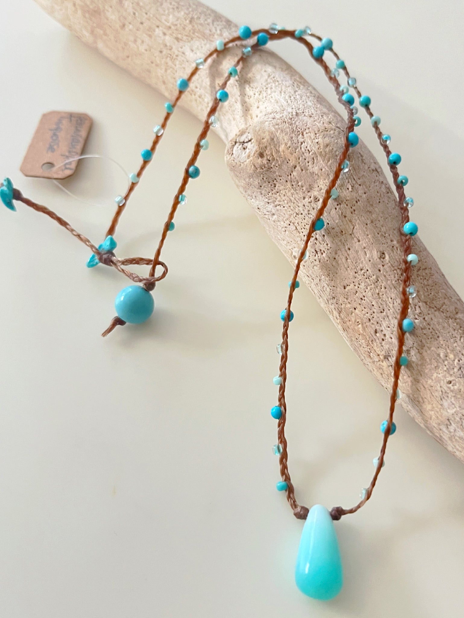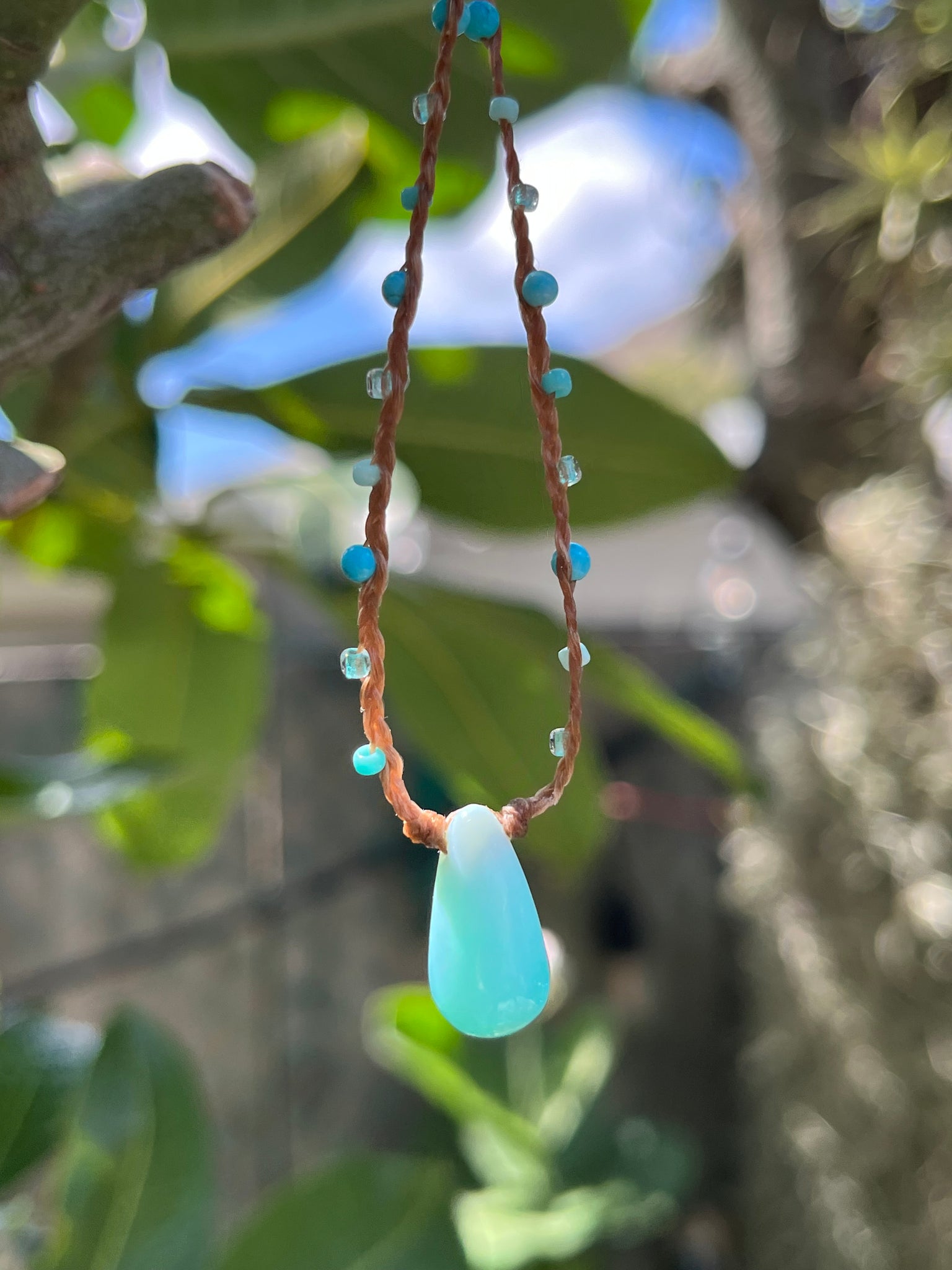 Materials: head charm(peruvian blue opal 1.8cmx1cm)/turquoise( smooth round 3mm)/seed beads(11/0 3colors)/sinew wax cord(brown)