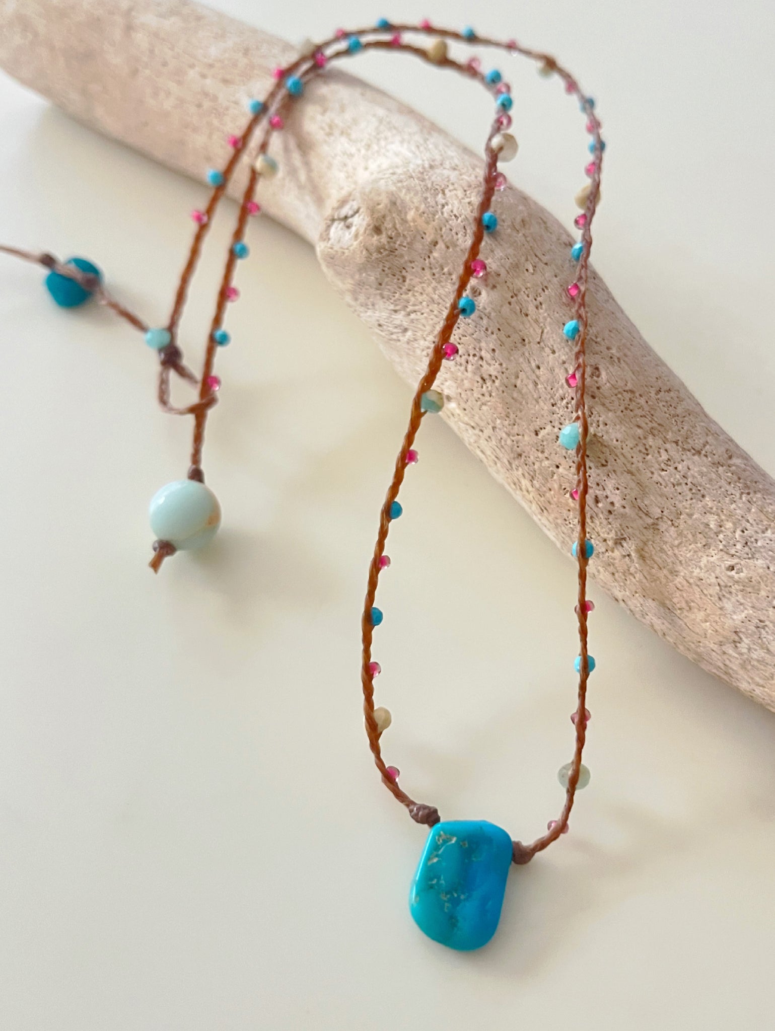 Materials: head charm(turquoise sleeping bueaty1.2cmx1cm)/turquoise( faceted round 2mm)/jasper matte(3mm)/jasper(8mm smooth round)/seed beads(11/0 )/sinew wax cord(brown)