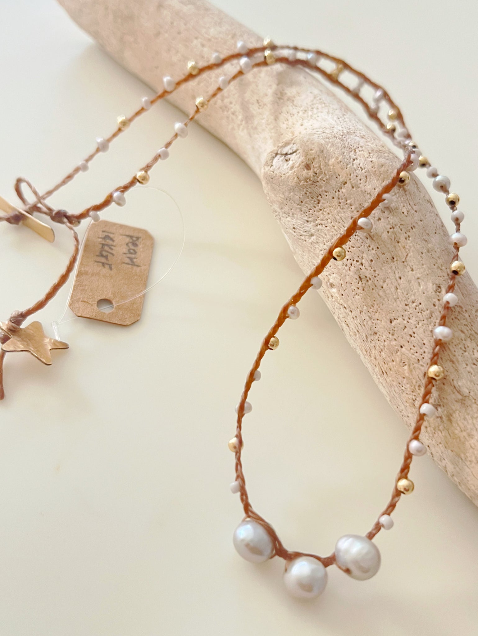 素材:ヘッドチャーム(淡水パール・グレー6mm)・淡水パールグレー3mm・14kゴールドフィル(シームレスボール2.5mm・ワイヤー16ゲージ・スターチャーム)・シードビーズ(11/0 グレー)・シニューワックスコード(ブラウン)