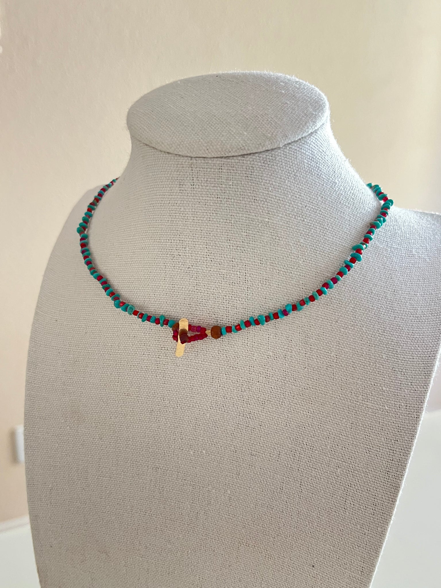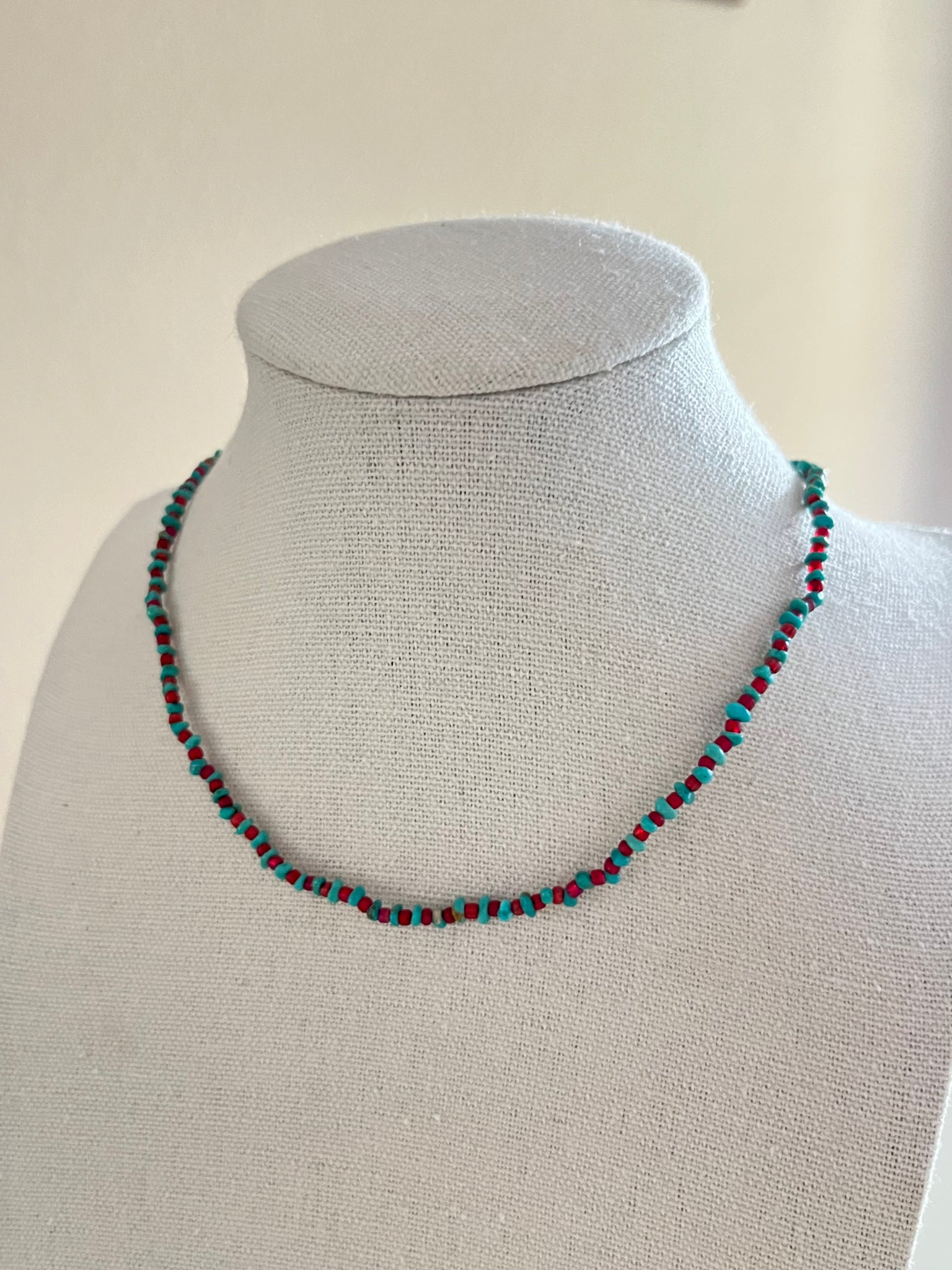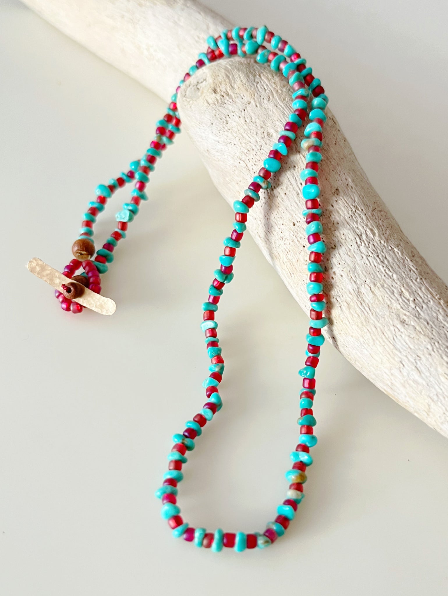 Materials: Turquoise(2mm-3mm)/seed beads(11/0 neon red )/sandal wood(4mm)/silk thread (#2 red)/14k gold filled