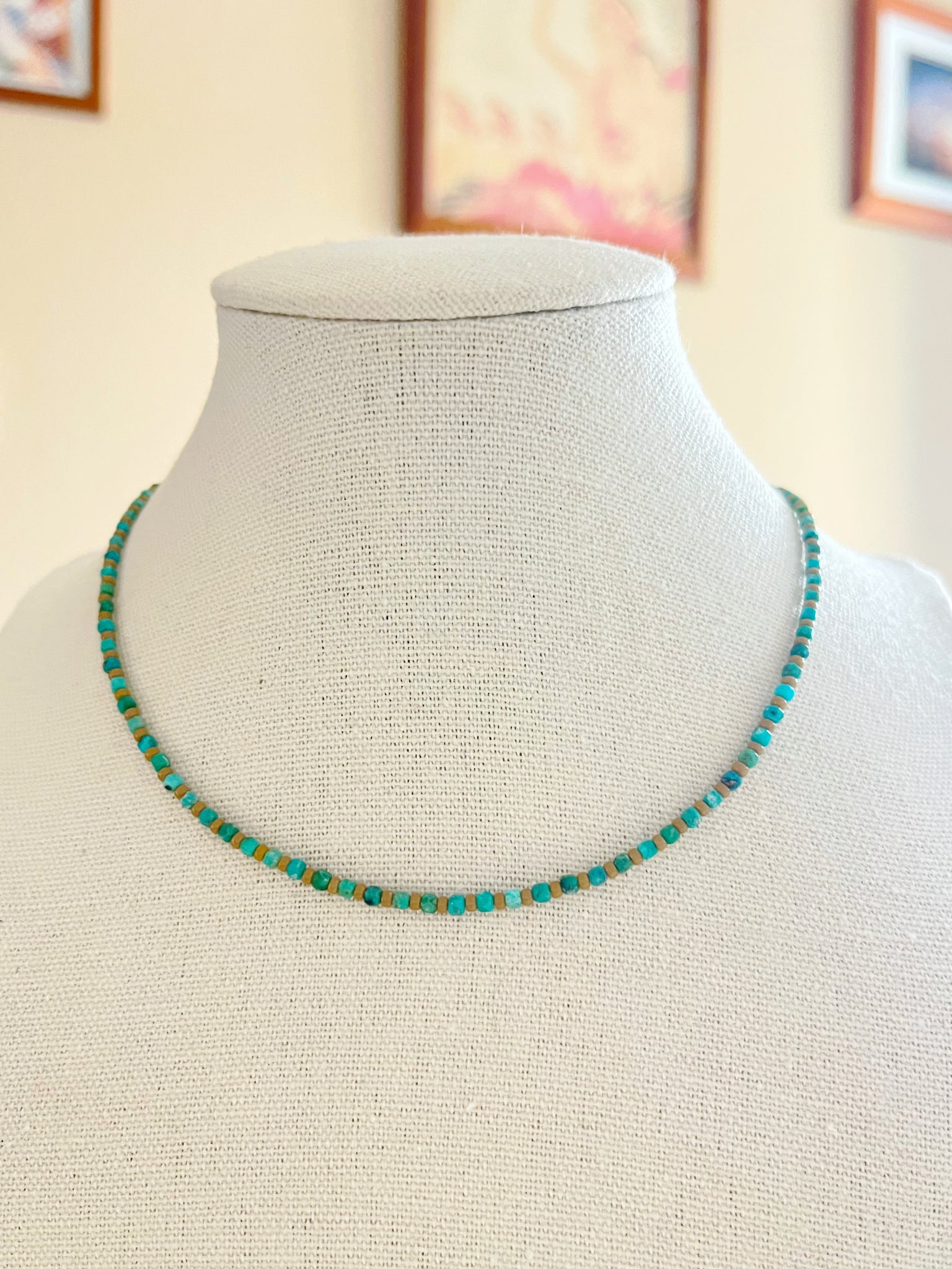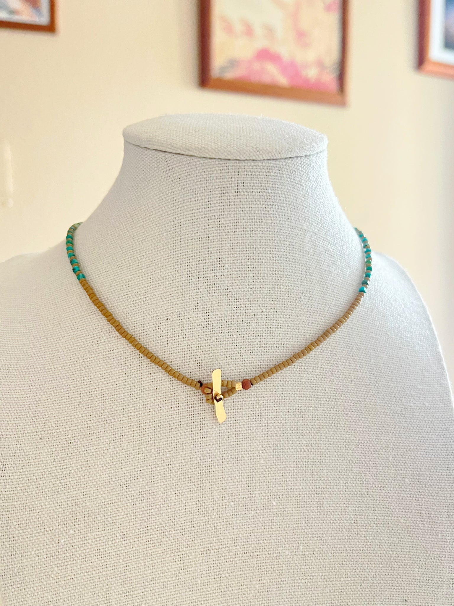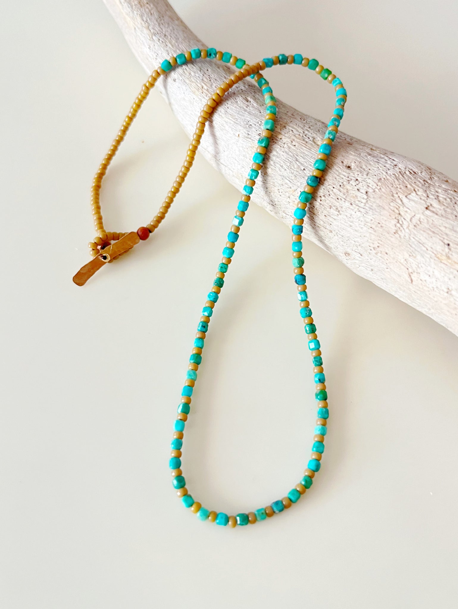 Materials: Turquoise(square 2mm)/seed beads(11/0 light brown )/sandal wood(3mm,4mm)/silk thread (#2 brown)/14k gold filled
