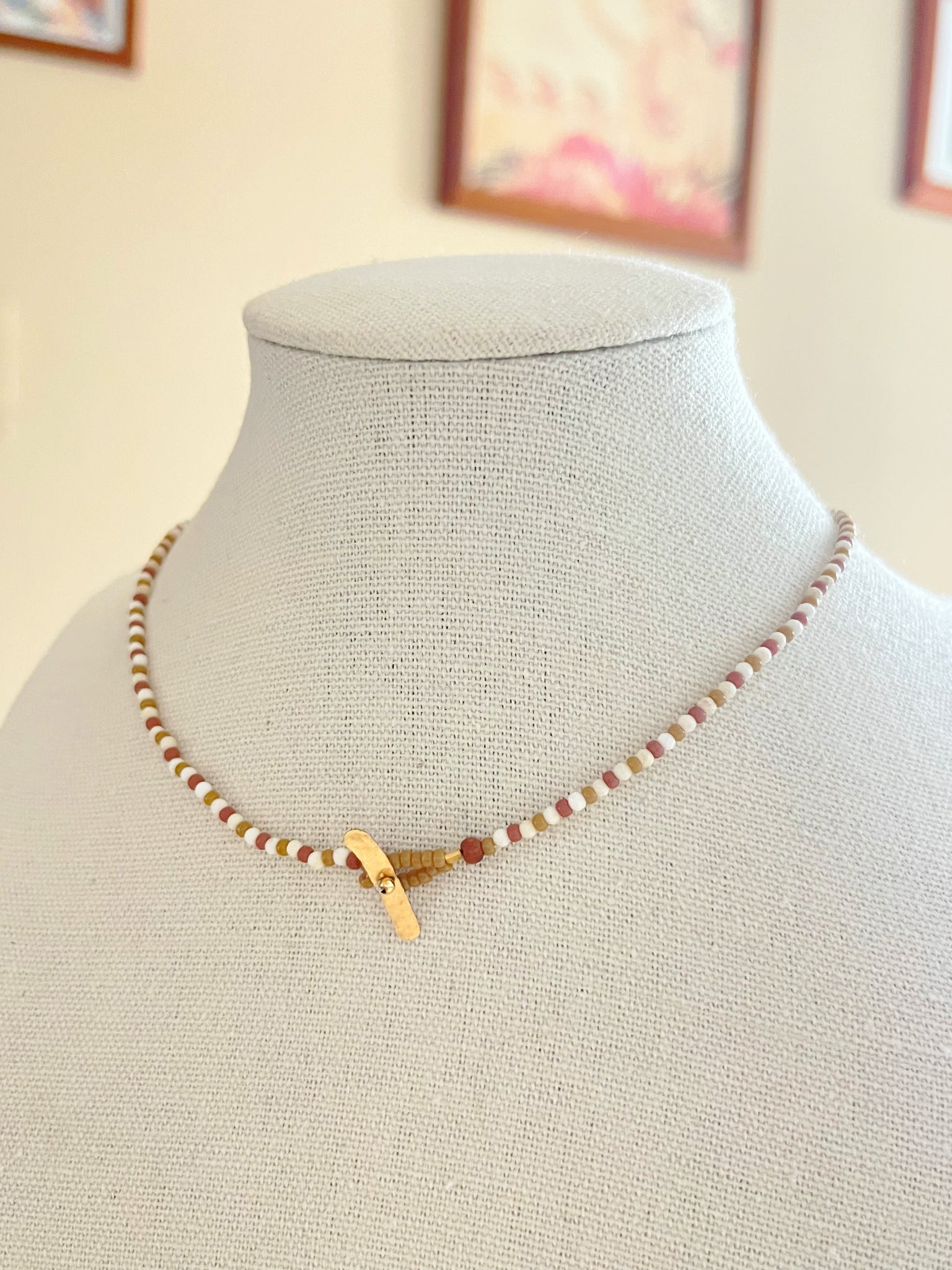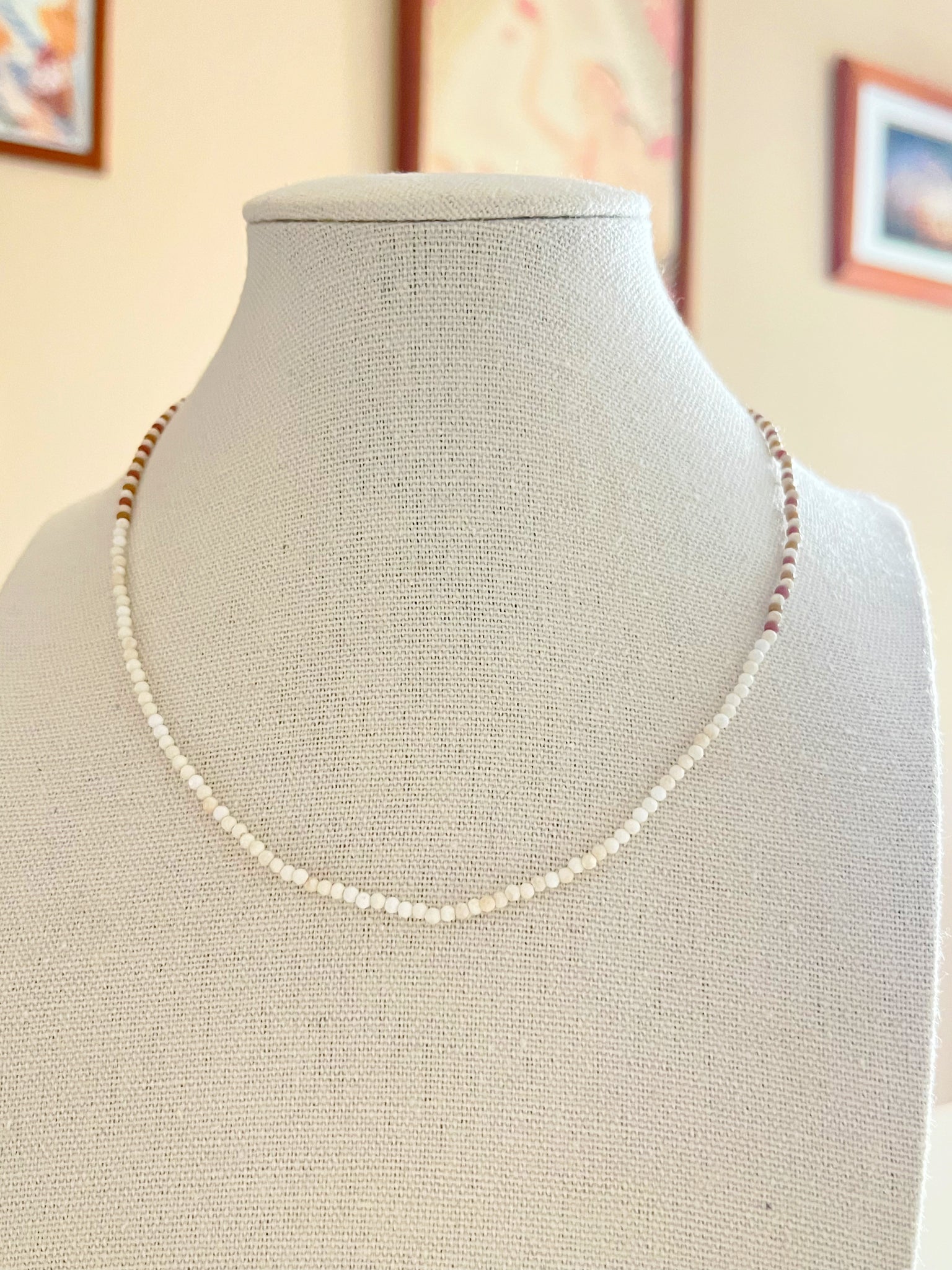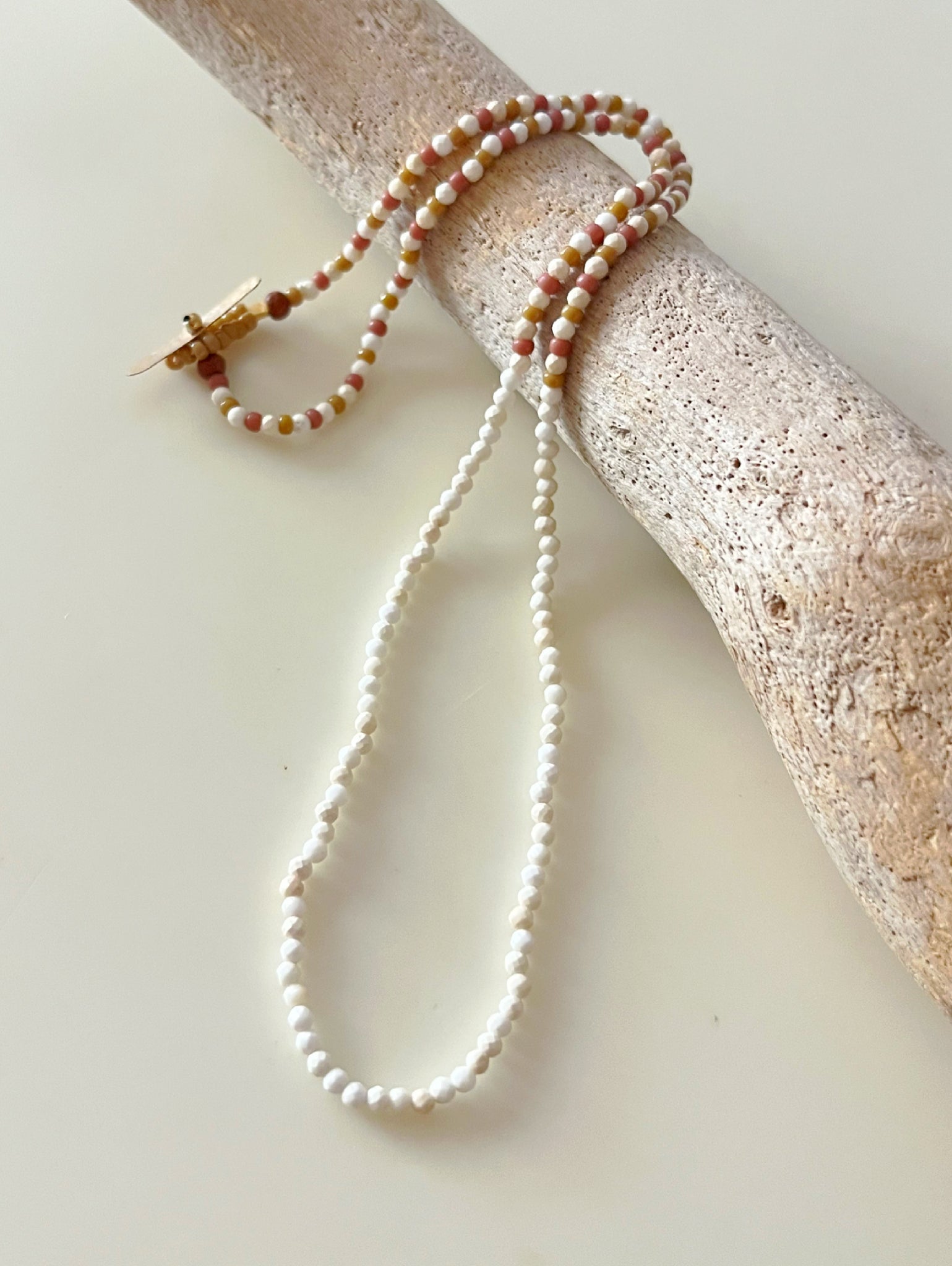Materials: howlite(round faceted 2mm)/seed beads(11/0 light brown )/sandal wood(3mm)/silk thread (#2 brown)/14k gold filled